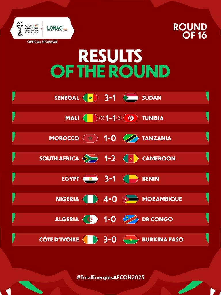 अल्जेरियाले डिआर कंगोलाई अतिरिक्त समयमा १–० ले हराउँदै क्वार्टरफाइनलमा पुगेको छ। खेल पेनाल्टीतर्फ जाने देखिएको बेला आदिल बुल्बिनाले ११९औँ मिनेटमा पेनाल्टी बक्स बाहिरबाट निर्णायक गोल गरे। पहिलो हाफमा अल्जेरियाले बल नियन्त्रणमा राखे पनि अवसर बनाउन सकेन। दोस्रो हाफ प्रतिस्पर्धात्मक रह्यो, तर गोल भएन। अतिरिक्त समयमा डिआर कंगोका गोलकिपरले बचाउ गरे पनि बुल्बिनाको गोल रोक्न सकेनन्।