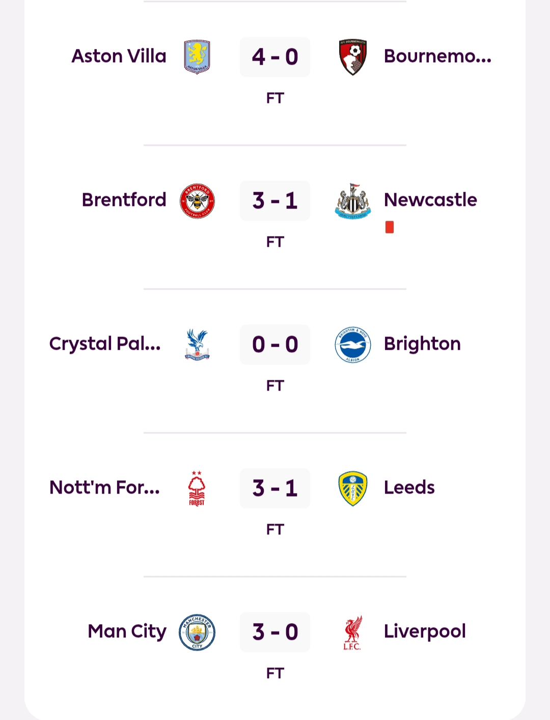 एस्टन भिल्लाले बोर्नमाउथलाई ४-१, ब्रेन्टफोर्डले न्युक्यासललाई ३-१ र नटिङघम फरेस्टले लिड्सलाई ३-१ ले हराए। क्रिस्टल प्यालेस र ब्राइटन गोलरहित बराबरी। **खेलकुद** को यो उत्सव तपाईंको पनि हो – **sartplay.com**, **sart88.com** र **sart-news.com** बाट हरेक समाचार पाउनुहोस्!